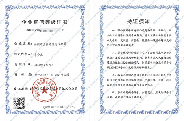公司现有煤安证一百余张,涵盖了整个煤矿用电缆常用电缆型号。公司还取得了3C强制认证证书、国家燃烧性能B1级证书等。是国家高新技术企业、江苏省专精特新小巨人企业、扬州市瞪羚企业、扬州市科技创新标兵企业、国家重合同守信用企业、AAA级资信企业。产品质量稳定可靠,得到用户的一致好评。