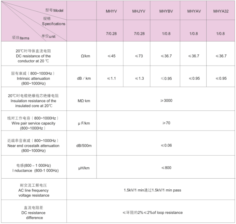| MHJYV | 1x2 | 4/0.28铜线+3/0.28钢线4/0.28 copper wire+3/0.28 steel wire | 0.45 | ≤7.1 |
