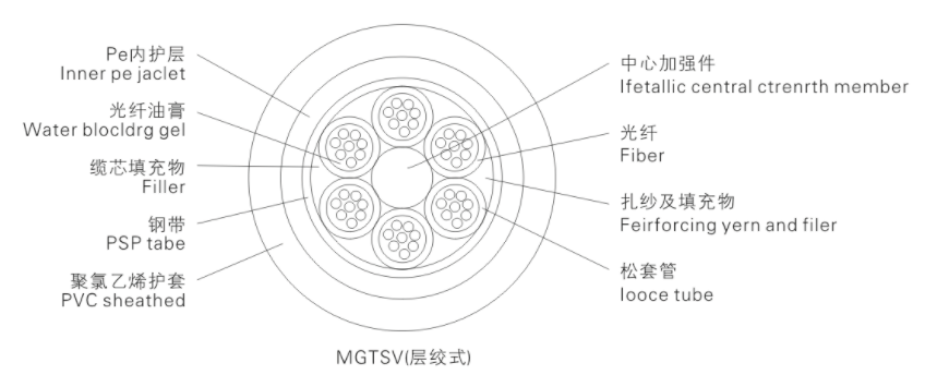 MGTSV(2~144)B(2~144)A | 煤矿用金属加强构件松套层绞填充式钢-聚乙烯粘结护套、阻燃聚氯乙烯护套通信光缆 Coal mine with metal strength member of loose tube layer strandedfilling type steel and polyethylene stickySheath, and flame retardant PVC sheathed communication opticalcable | 用于干扰较大的平巷、斜巷 To interfere with the larger drift.inclined lane |
