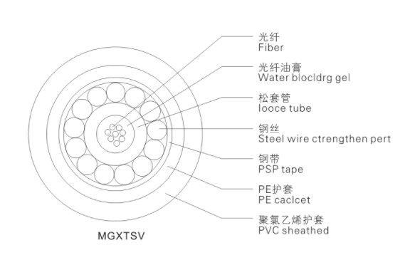 MGTSV(2~144)B(2~144)A | 煤矿用金属加强构件松套层绞填充式钢-聚乙烯粘结护套、阻燃聚氯乙烯护套通信光缆 Coal mine with metal strength member of loose tube layer strandedfilling type steel and polyethylene stickySheath, and flame retardant PVC sheathed communication opticalcable | 用于干扰较大的平巷、斜巷 To interfere with the larger drift.inclined lane |