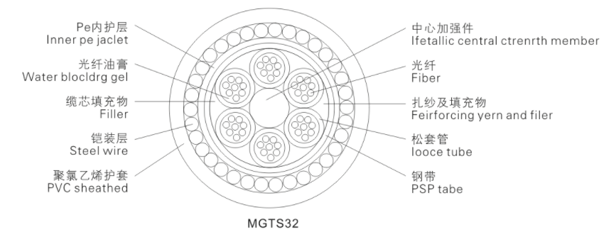 金属中心加强件:光纤松套管,线芯填充油膏:双面涂塑钢带粘接PE内护套;铠装钢丝+聚氯乙烯护套